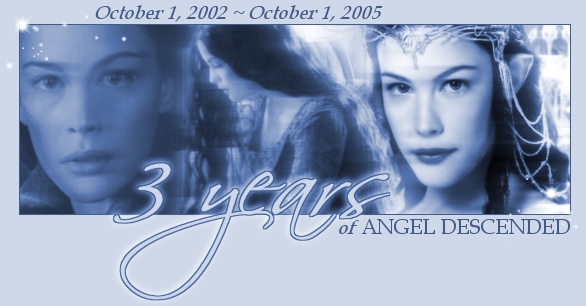 | Wow. Three years online. That's mindblowing. When I first began this working on this site, in the February of 2002, I had no idea that it would be as large as it turned out to be. When I launched it in the October of the same year, I still had no idea it would become as large as it is now. I was still an adolescent, coming out of the worst breakup of my life, and more than slightly unsure of what I was doing. This shrine was a much-needed distraction. Now, I'm leaving adolescence behind me, still not sure of what I'm doing, and this site has become a labour of great love -- but one thing hasn't changed: I still love this site, and I still adore Arwen Undómiel. I still hope that, through Angel Descended, I can create new fans of the elven princess, and perhaps bring a smile to the faces of those who already love her. It's been difficult at times; not sure whether it was really worth the effort, whether my skills as a webmistress (both design-wise and in interacting with the fandom) have been up to par. But I'm still updating, still finding new things to add, new reasons to love working on this site. I'm filled with both pride and gratitude, looking back -- proud of myself for keeping working on this site, my absolute opus, and grateful for the support I've gotten along the way. Special thanks, of course, goes to Mary and RosieSamFrodo.Com for hosting this endeavour of mine; heaven knows whether it would even be around today if it couldn't have called RSF its home. And, of course, thanks to the many contributors and visitors who made AD what it is today. Hantalë tenoio. ~ Kirryn :: back to main :: back to site info :: |